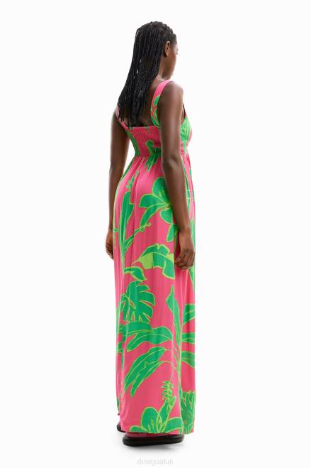 A long dress with straps, a tropical print, a sweetheart neckline with ties and shaped just below the bust.