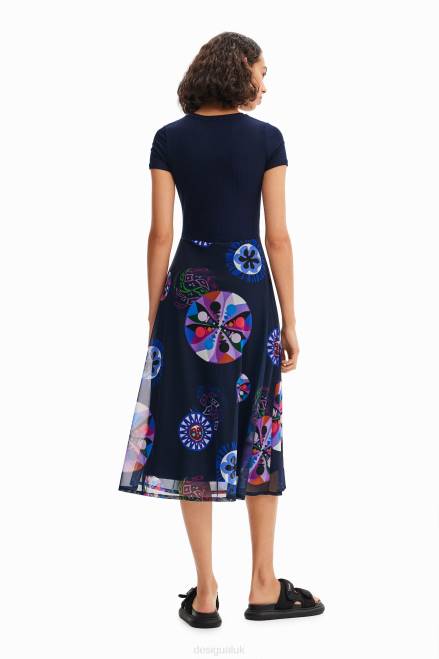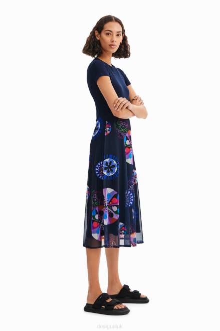 A long dress in a two-piece effect: a plain, short-sleeve, ribbed T-shirt and a tulle skirt in a multicolour print. Designed by M. Christian Lacroix.