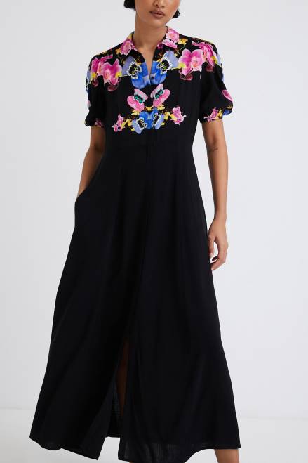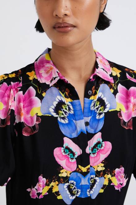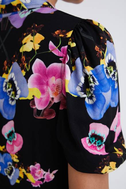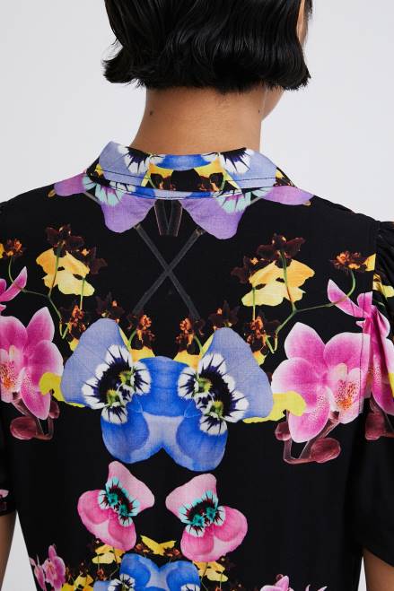 Orchid positional floral print with a mirror effect on the upper part and the hem. This dress, designed by M. Christian Lacroix, has a wonderful drape thanks to the lightness of the fabric.