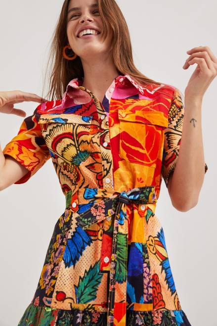 Made from an elasticated eco-friendly viscose, this shirt dress features an A-line skirt and a tie belt on the waist. The print, by M. Christian Lacroix, features a patchwork of floral prints.