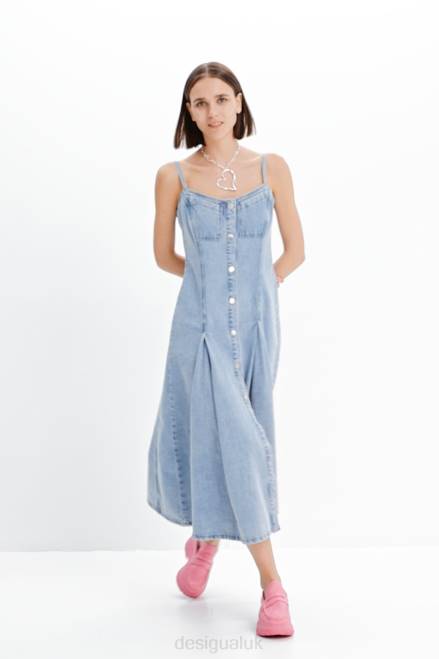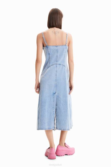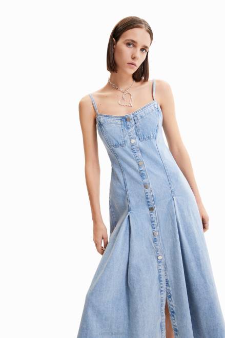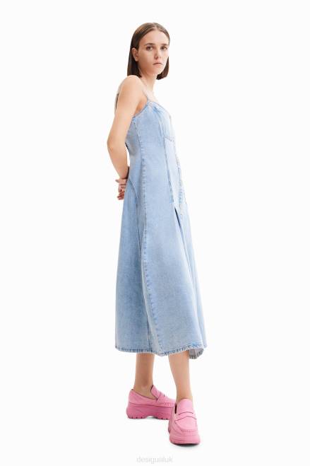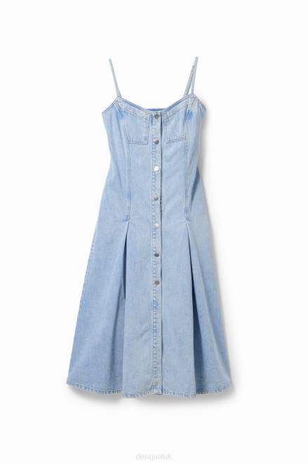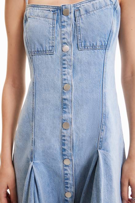 A fitted strappy denim dress with pleats from the hips, a slit at the back and snap fasteners at the front. Designed by Maitrepierre.