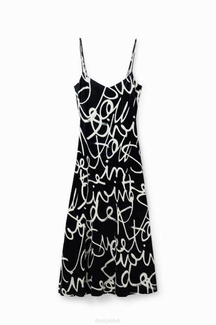 A strappy midi dress with a fitted top part and stretch satin fabric with a contrasting message print.