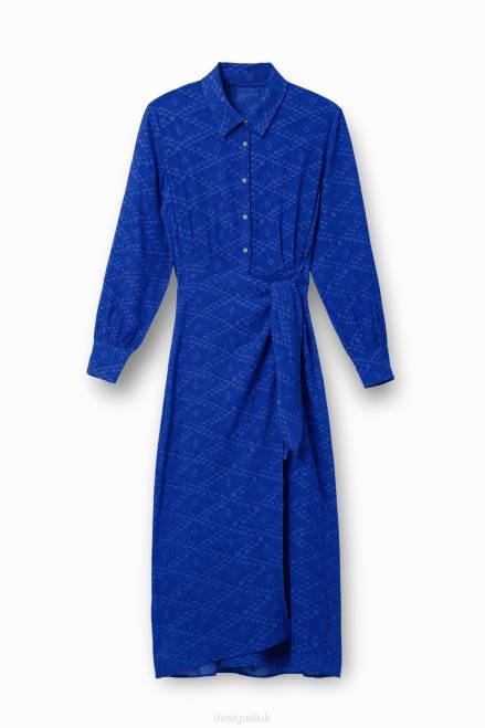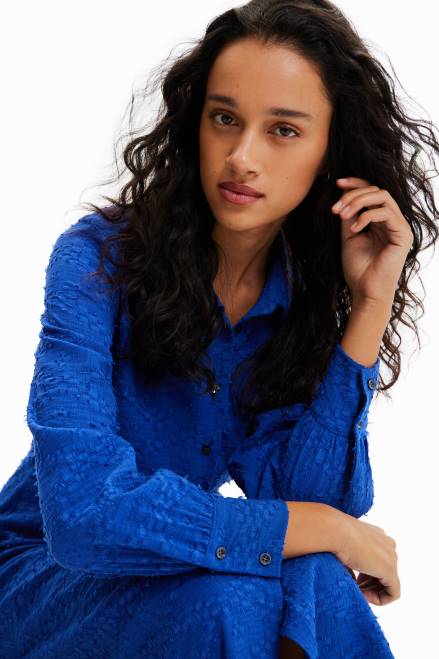 A long-sleeve midi shirt-dress in textured fabric with a handkerchief-style wrap skirt.