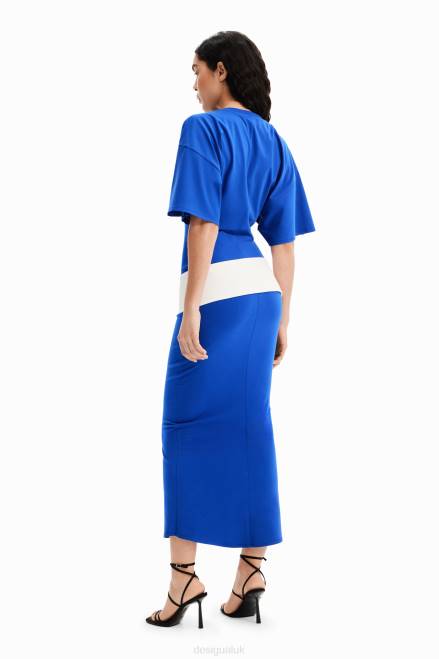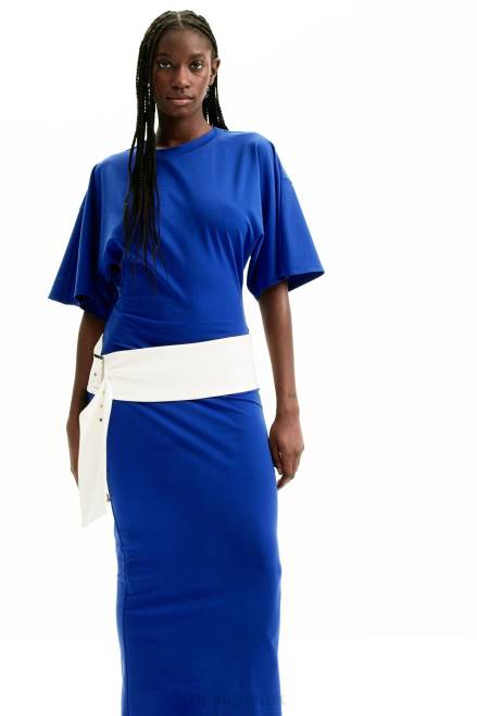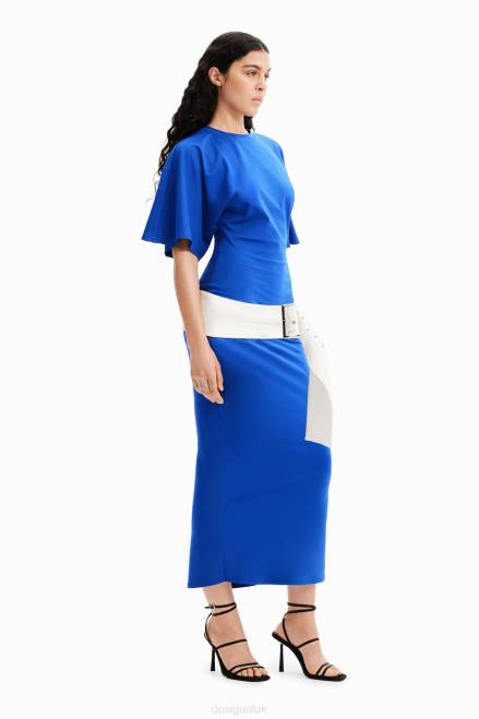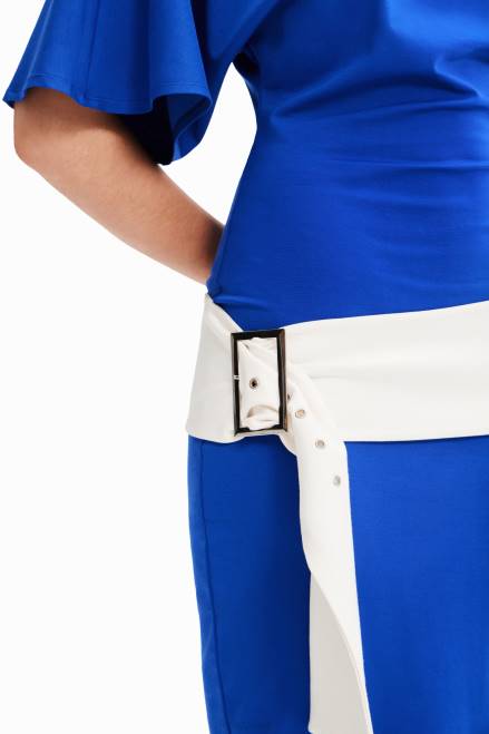 A short-sleeve midi dress with stretch ponte roma fabric and a contrasting wide belt. Fitted at the waist with a pencil skirt and wide sleeves. Designed by Nathy Peluso.