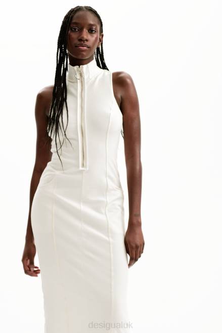 A fitted sleeveless midi dress featuring a front zip, stretch plush fabric with outside seams and pockets. Designed by Nathy Peluso.