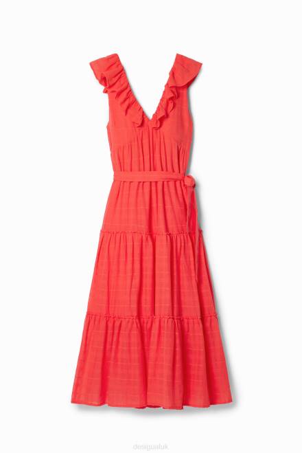 A sleeveless midi dress with a ruffle on the neckline and a belt, with gathered panels on the skirt and crinkle-textured fabric.