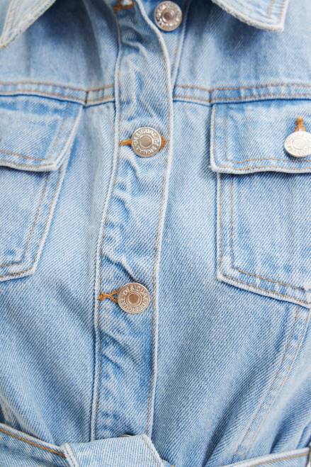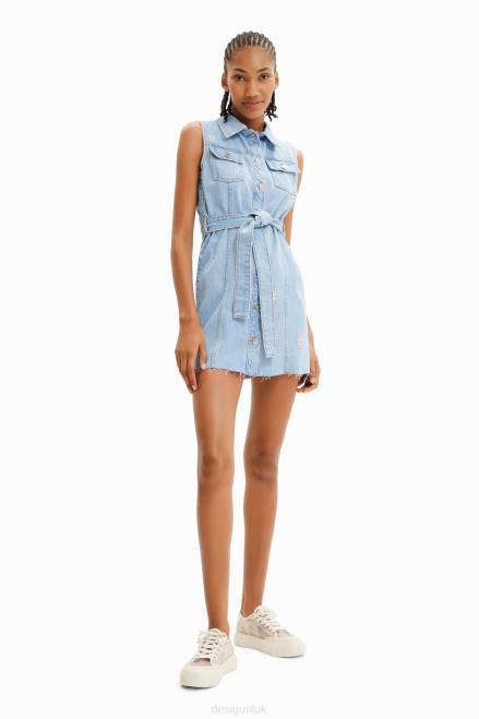 A short, sleeveless, denim dress in a shirt style, with a belt and embroidered flowers.
