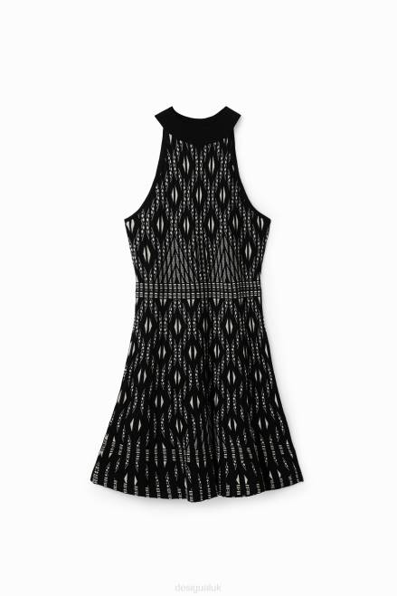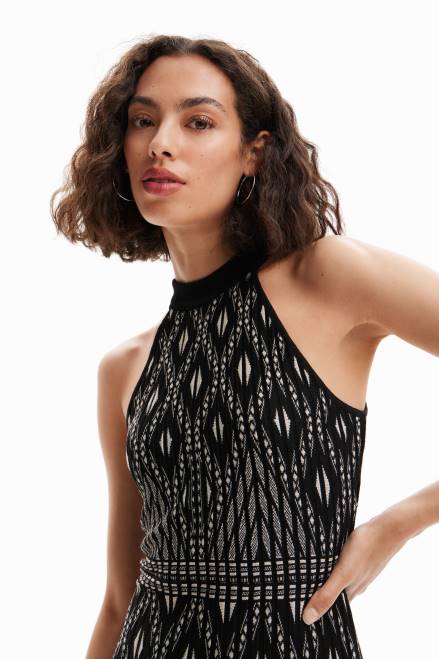 A short, fitted, sleeveless dress in ribbed knit with contrasting diamonds, a halter neck and A-line skirt.