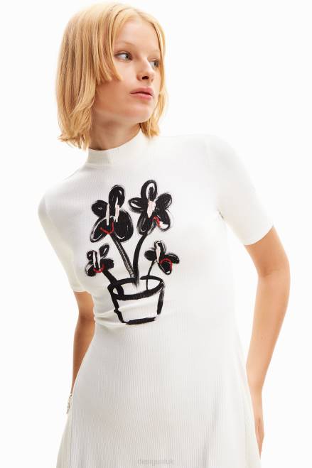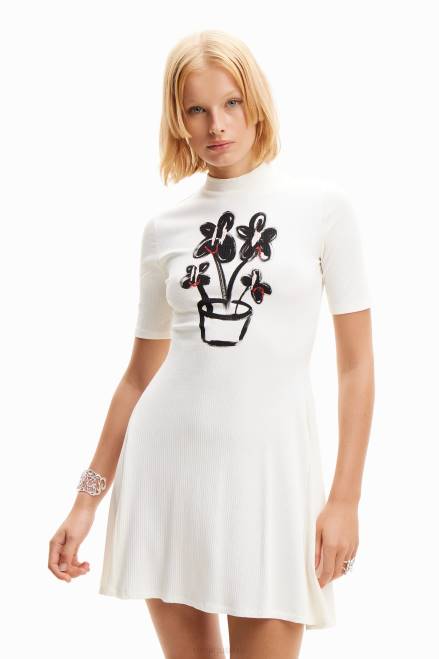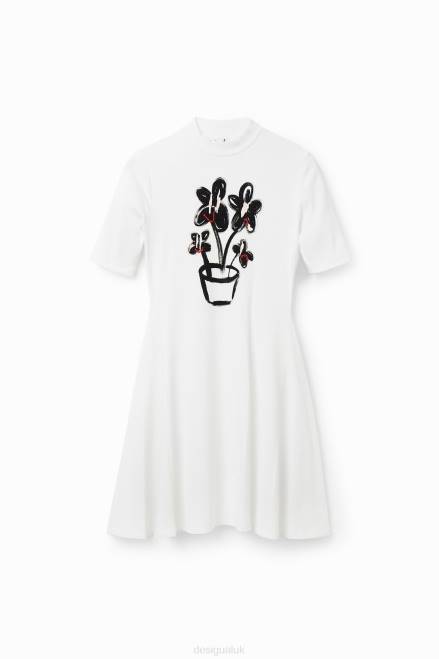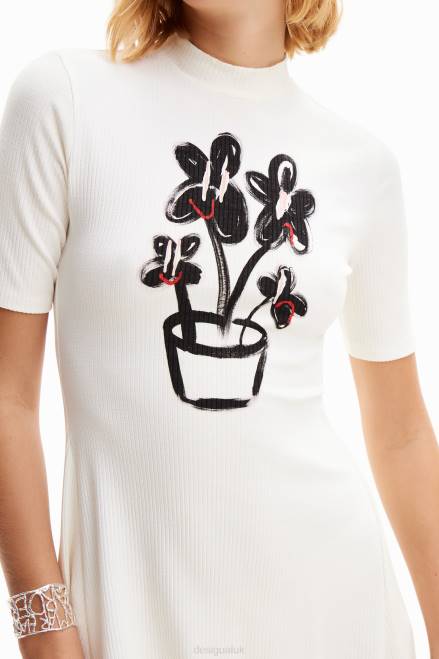 A short, fitted skater dress with short sleeves in ribbed knit with an A-line skirt. Featuring a flower pot Illustration.