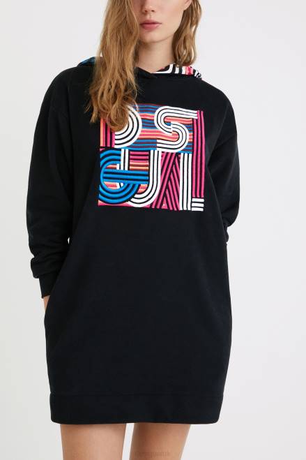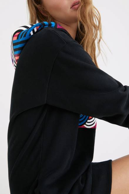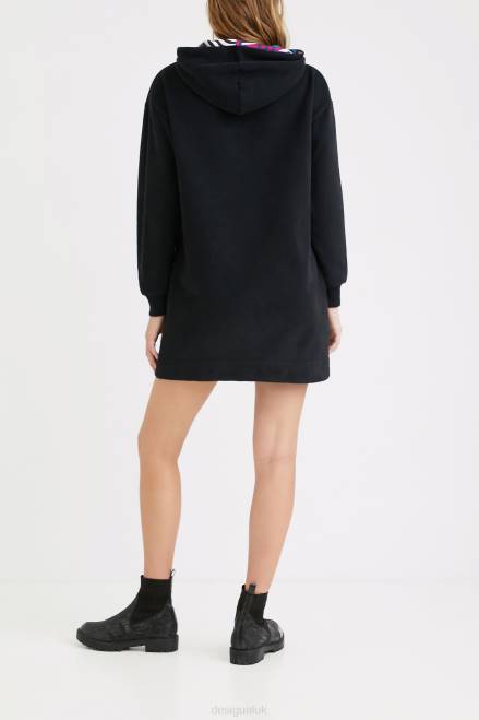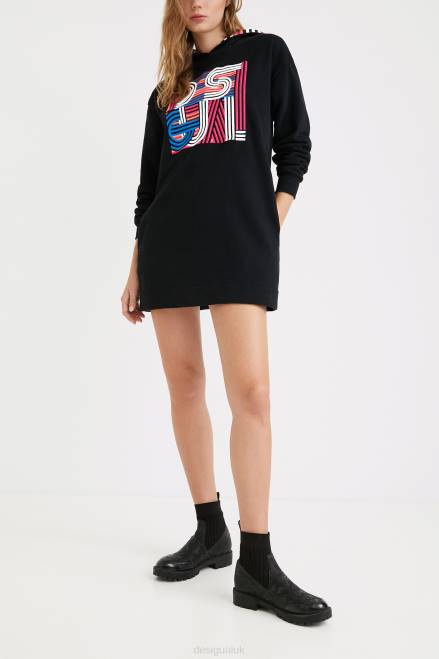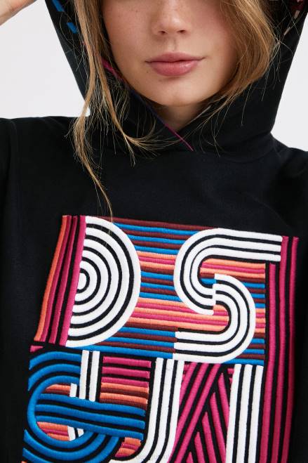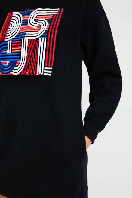 This short plush hooded dress with embossed embroidery on the chest is so comfortable you can also wear it as a long sweatshirt. Play around and pair it as you please.