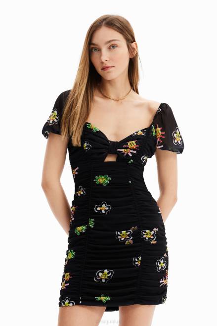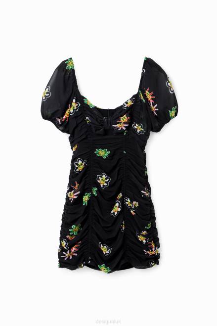 A short fitted dress with puff sleeves, a sweetheart neckline, central knot detail and ruched body.