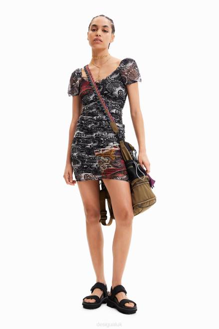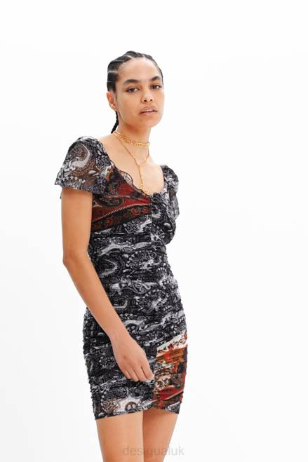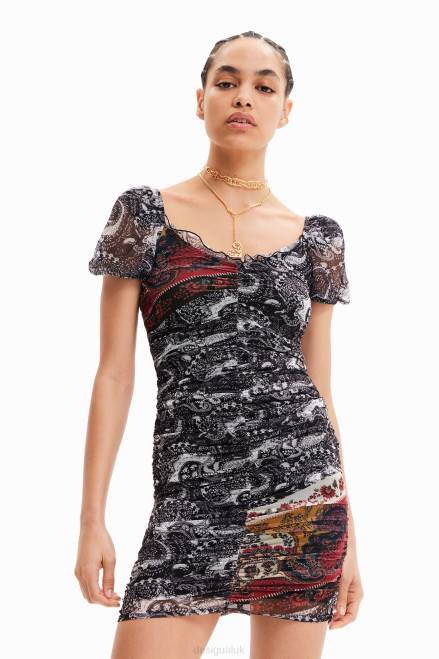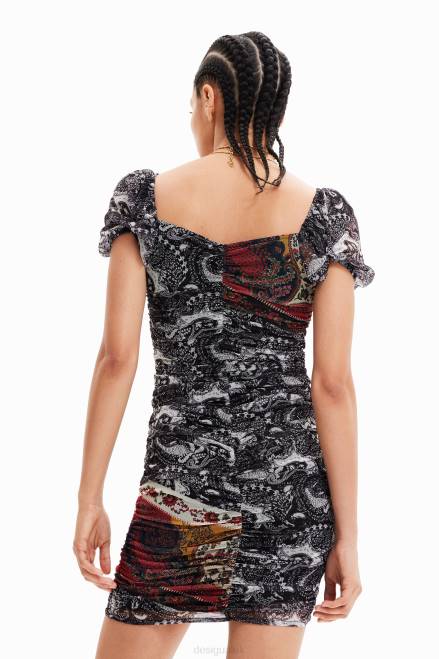 A short fitted dress with short puff sleeves and a ruched body. Featuring a Paisley print.