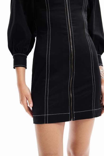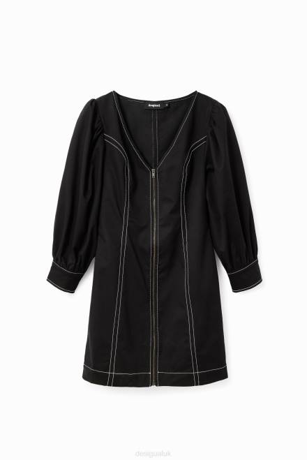 A short fitted dress with long puff sleeves, a front zip, V-neck and fabric in a peach-skin effect with contrasting seams.