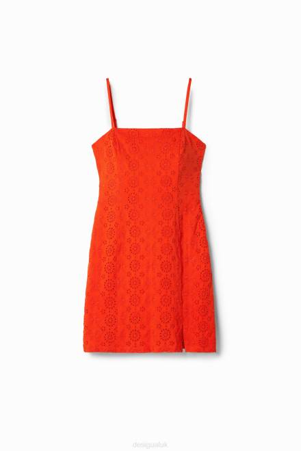 A fitted strappy short dress with stretch smock stitch on the back and fine knit fabric with Swiss embroidery.
