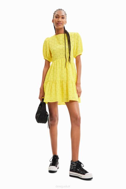 A short A-line dress with Swiss embroidery, short puff sleeves, a cut-out with lacing at the back and a ruffled skirt.