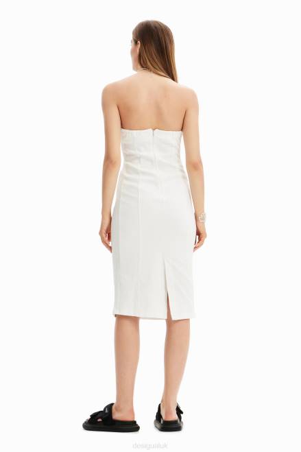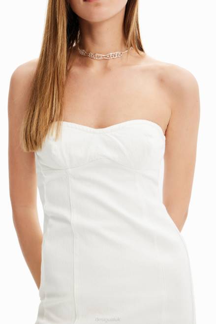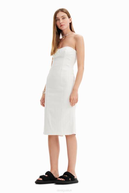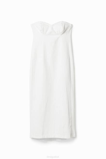 A fitted corset-style denim midi dress, with exposed shoulders, a sweetheart neckline, cups and side pieces in ribbed knit.