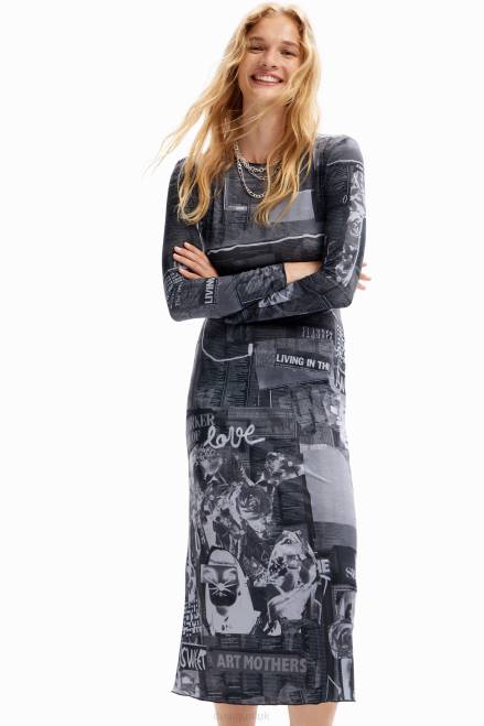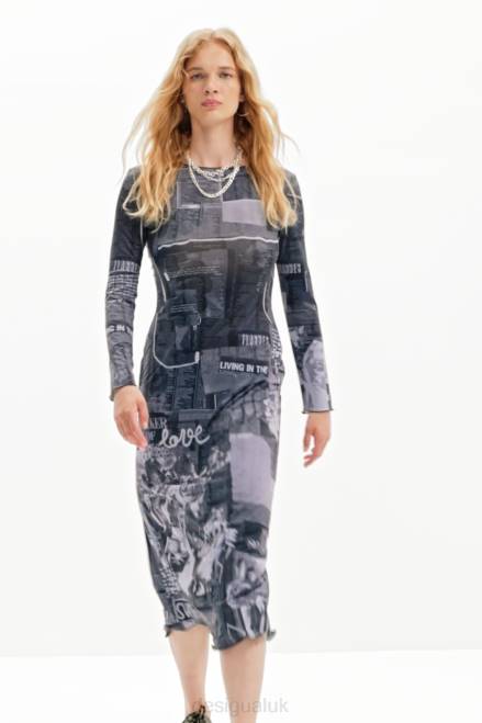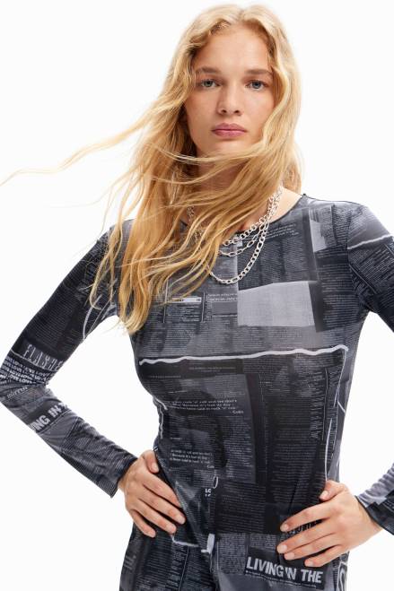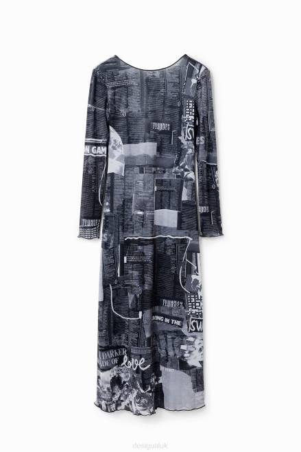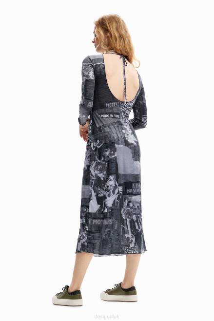 A fitted midi dress with long sleeves, a plunging back and satin fabric with a newspaper print.
