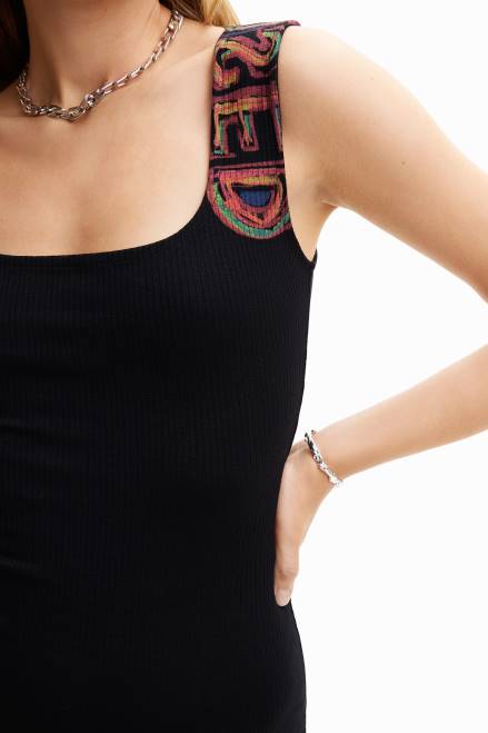 A fitted midi dress in ribbed knit with a print by Javier Mariscal on the straps.