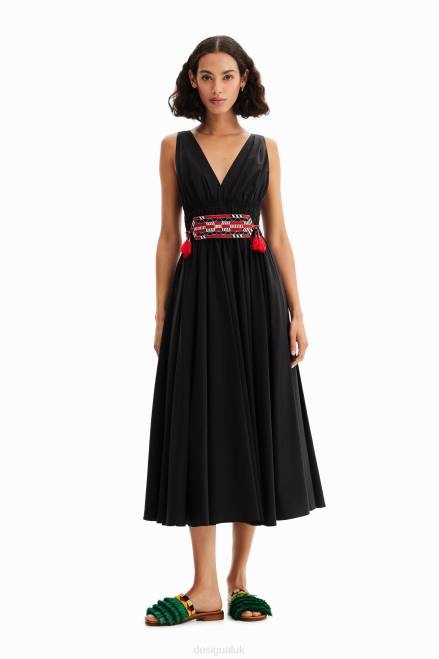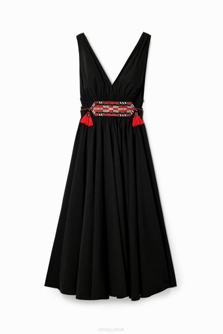 - Removable embroidered belt with drawstring and beaded pompom tassels