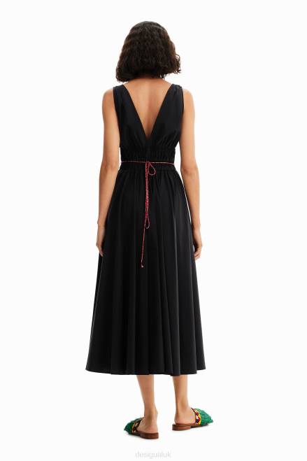 A midi dress with a plunging V-neckline, low-cut sides, fitted at the waist with a removable belt and floaty skirt. Designed by Stella Jean.