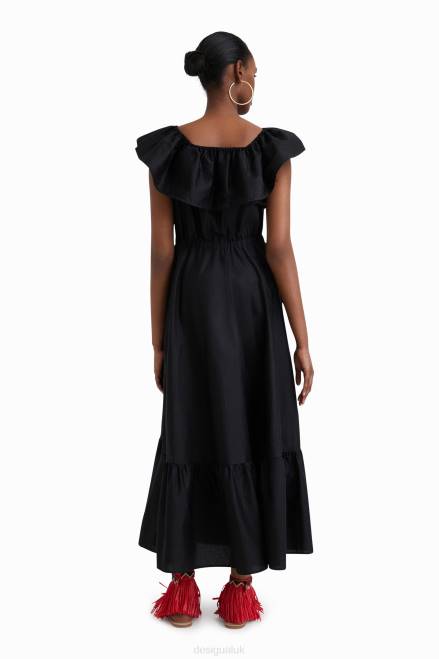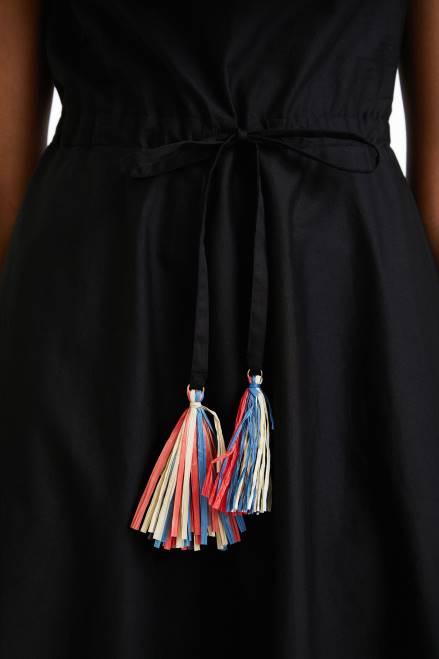 A boho midi dress designed by Stella Jean, featuring an elasticated neckline that can be worn on the shoulder or pulled down for a sexy touch.
