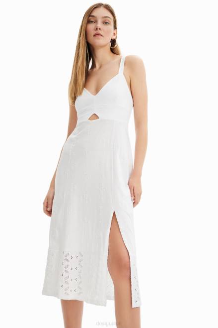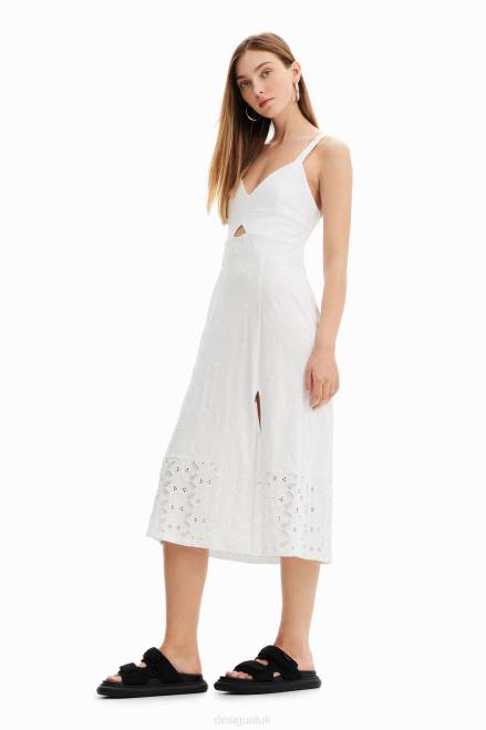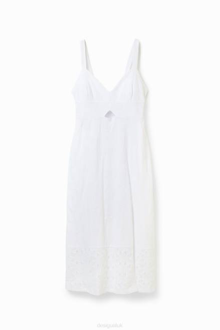 A midi dress with straps, a sweetheart neckline, embroidered fabric and a triangular cut-out under the bust.