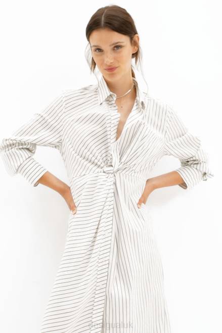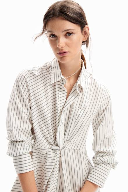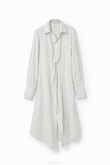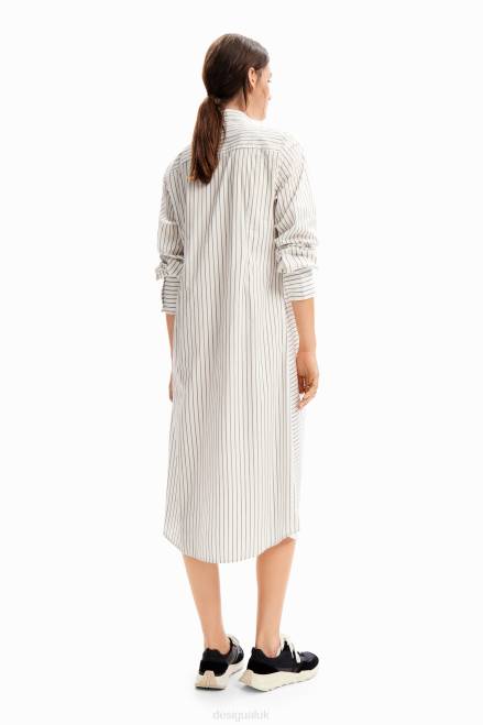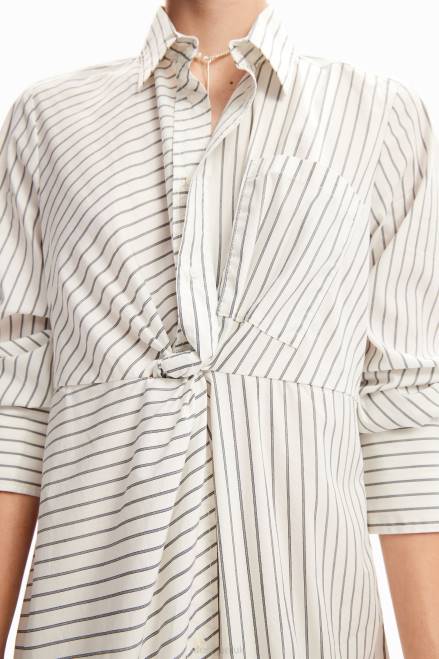 A shirt-style midi dress with drop shoulders, extra-long sleeves and cotton fabric with stripes in different directions on the front.
