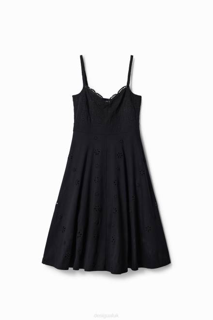 A strappy midi dress with a sweetheart neckline, stretch smock stitch on the back, an A-line skirt and fine knit fabric with Swiss embroidery.
