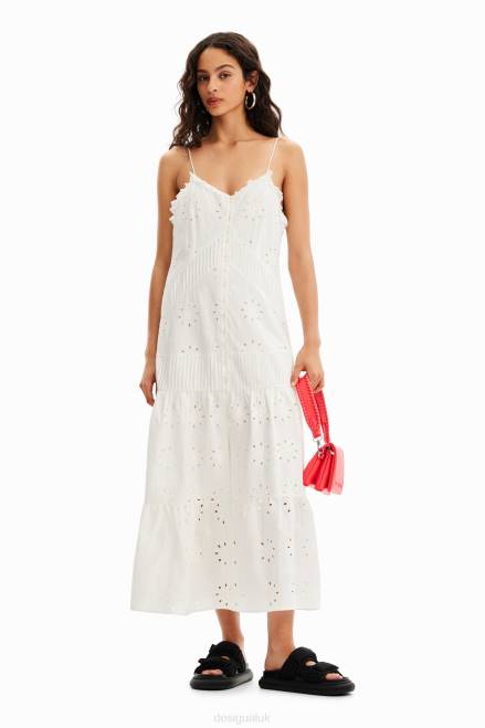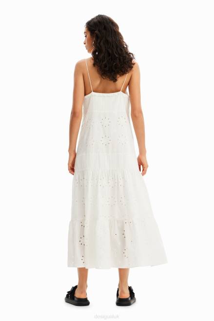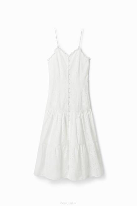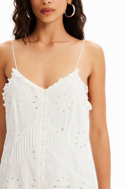 A strappy midi dress with buttons and gathered panels in cotton fabric with Swiss embroidery.