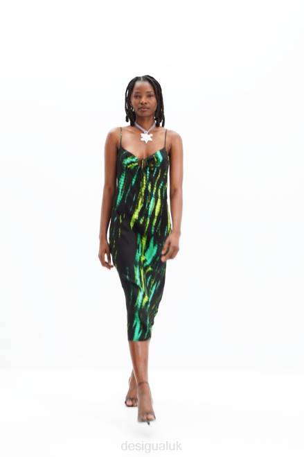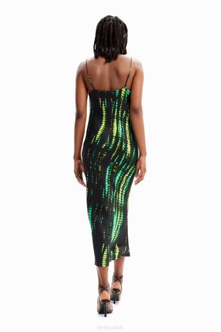 A fitted strappy midi dress with a slit, adjustable ties at the neckline and satin fabric with a tie-dye print.