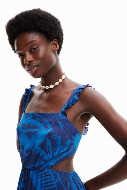 A midi dress with a wide neckline with cut-out at the back, side slits and straps with ruffles. Featuring a multicoloured tropical print.