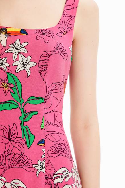 A short, sleeveless dress with a subtle fullness to the skirt and flowing fabric in a tropical print.