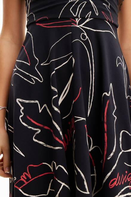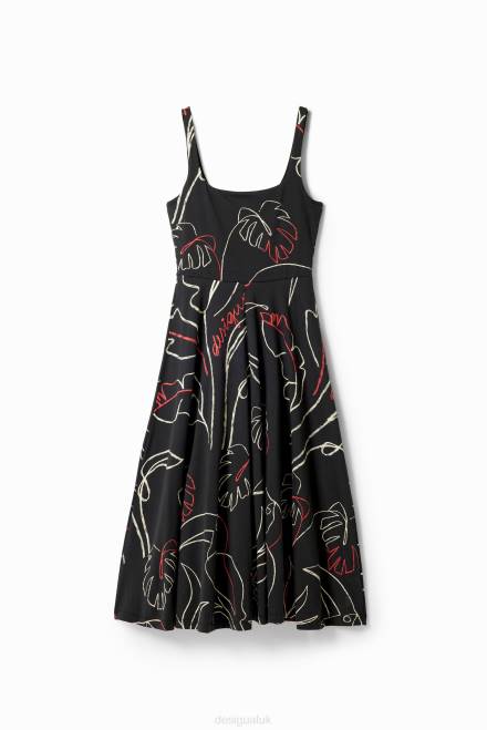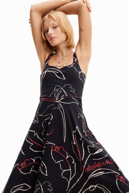 A midi dress with straps in stretch knit with an A-line skirt. Featuring an arty tropical print.