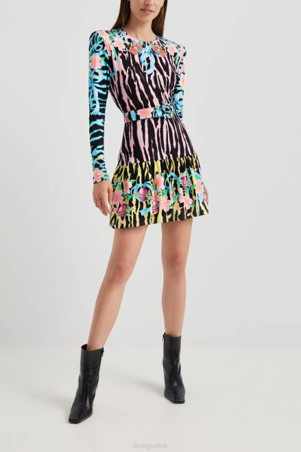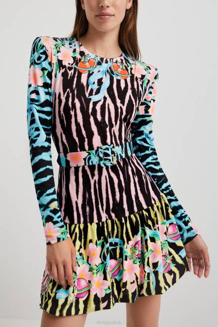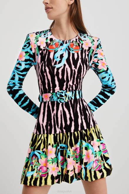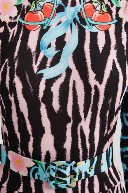 Maria Escote explores the most unexpected combinations in this long-sleeve slim dress with a short flounce skirt in a zebra print featuring flowers, cherries and planets in bright colours.