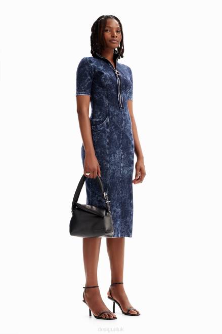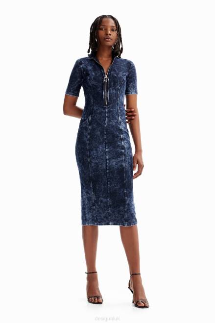 A fitted short-sleeve midi dress featuring a front zip, stretch plush fabric with exterior seams and pockets.