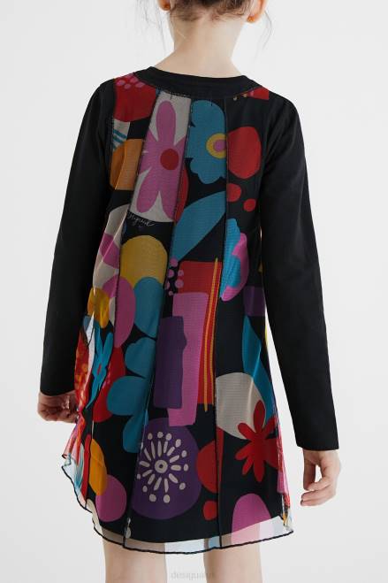 A mini-dress so fun, happy and original that the little ones of the house are going to love it. With vertical blocks printed in bright colours forming flowers and geometric shapes, has plain sleeves and the hem of the upper layer is of tulle.