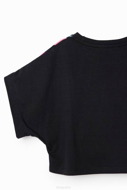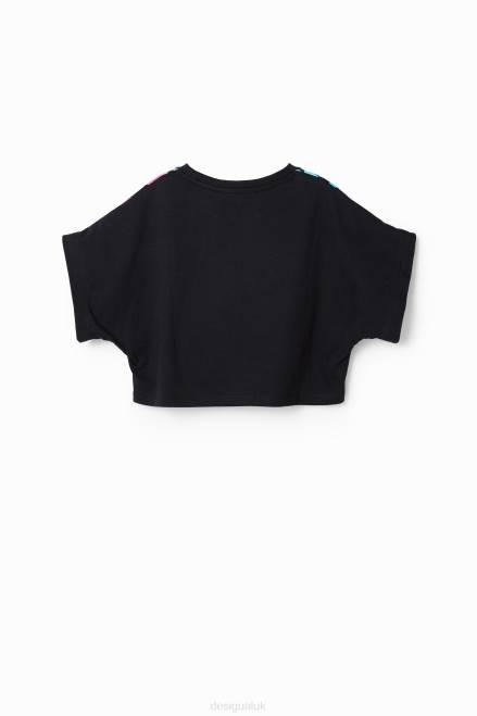A short T-shirt with batwing sleeves and a flower print with a glossy logo on the front.