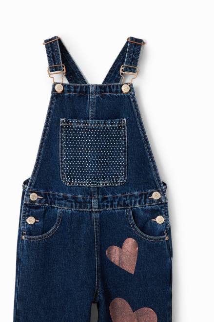 Straight denim dungarees with straps, printed hearts and rhinestone appliqueing on the front.