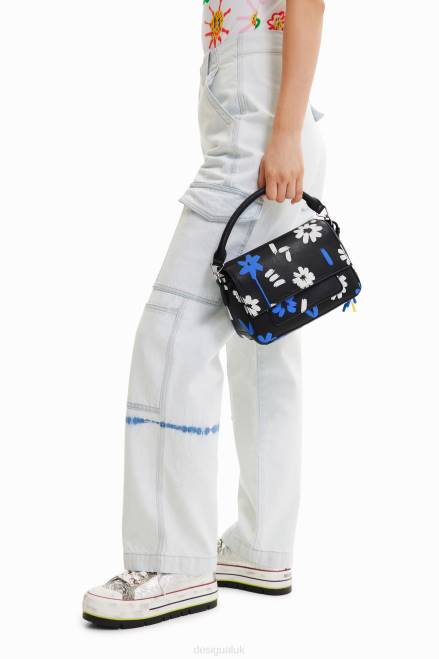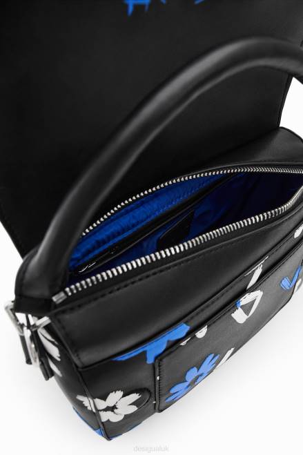 A small bag in leather-effect fabric featuring a floral print and embossed lettering. With a detachable charm with carabiner and cords.