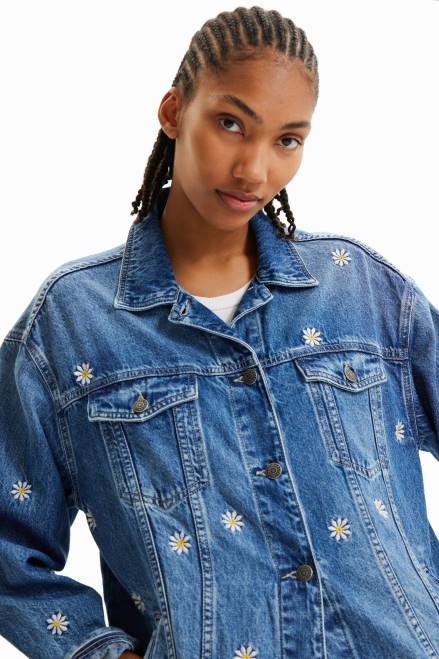 A denim trucker jacket in an overshirt style with a washed effect and contrasting embroidered daisies.