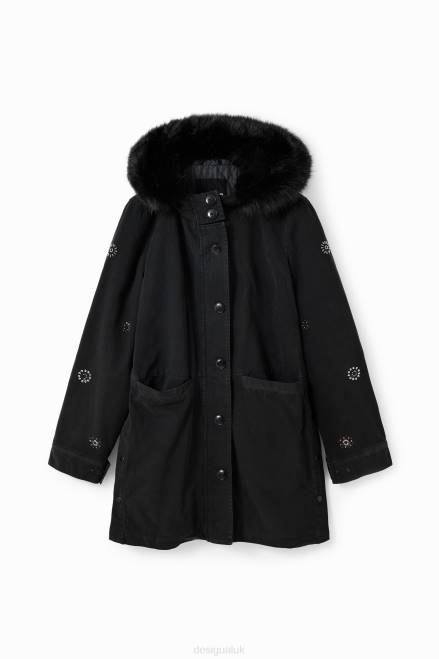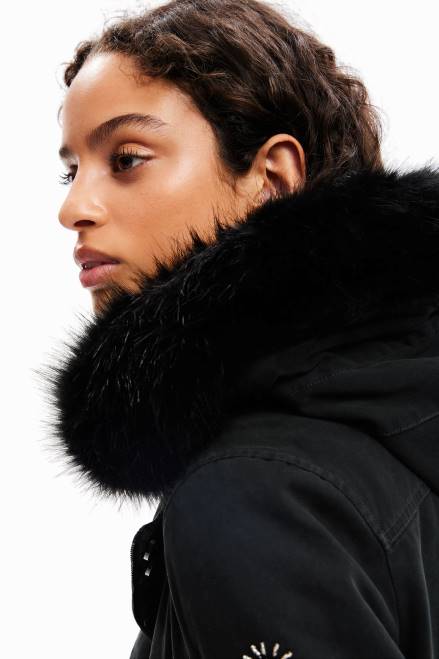 A parka with contrasting embroidery on the sleeves, a hood with removable fur-effect trim and side slits.