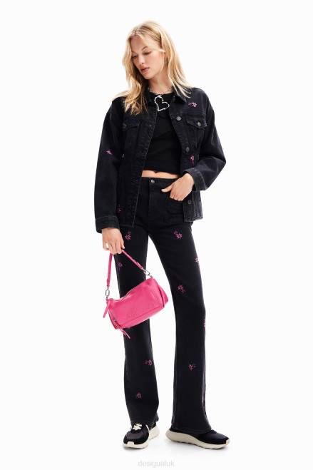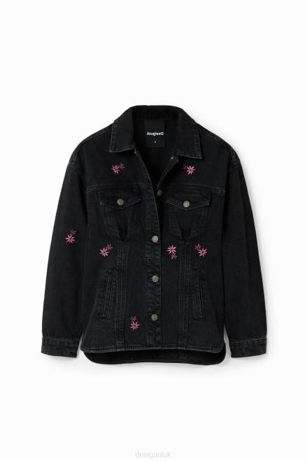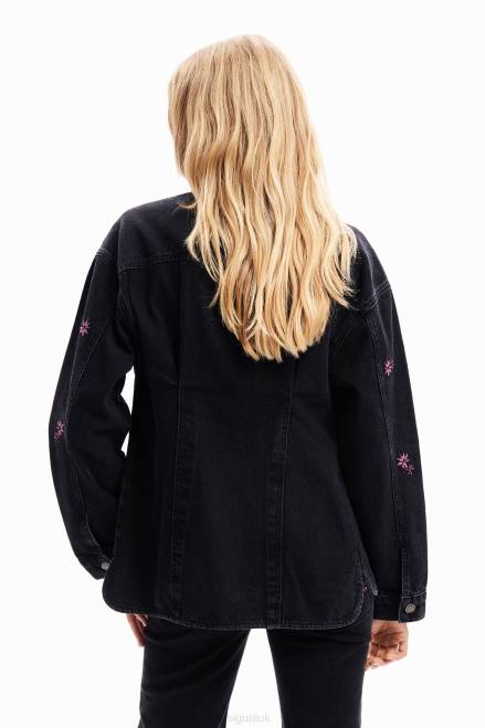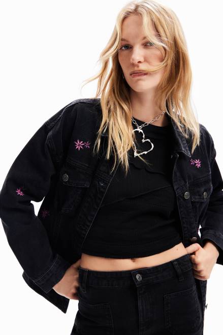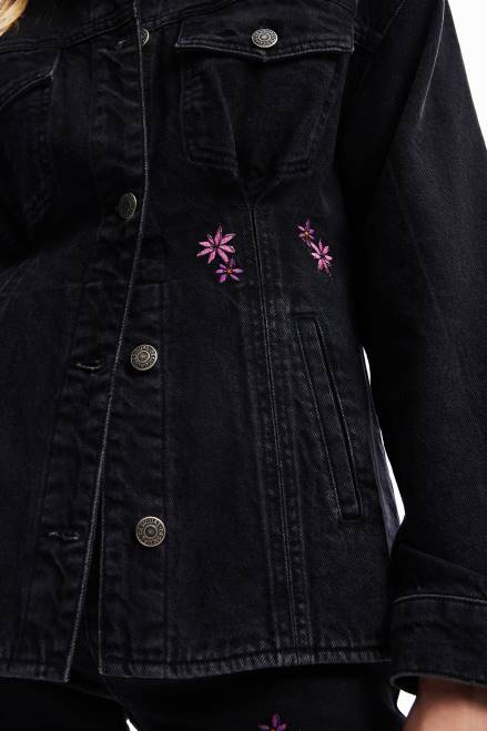 A fitted denim trucker jacket in an overshirt style, with central seams and contrasting floral embroidery.