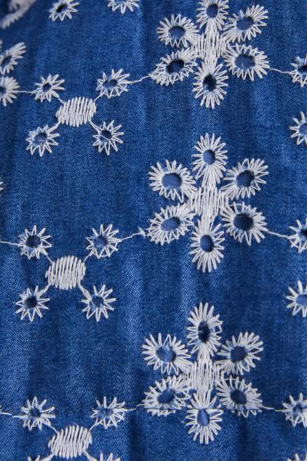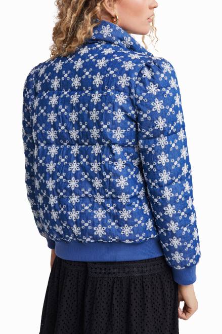 Extremely comfortable blue quilted jacket featuring a layer of Swiss embroidery white flowers. With a high quilted collar and elasticated cuffs and waistband. Made from recycled polyester.