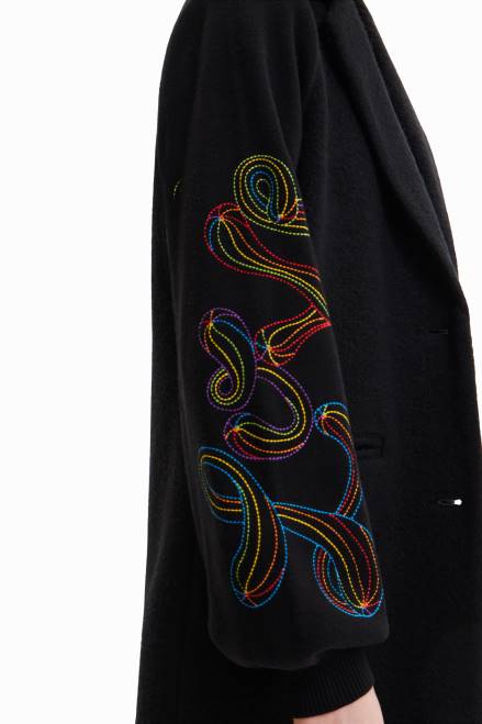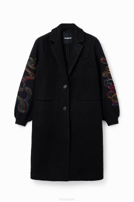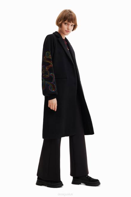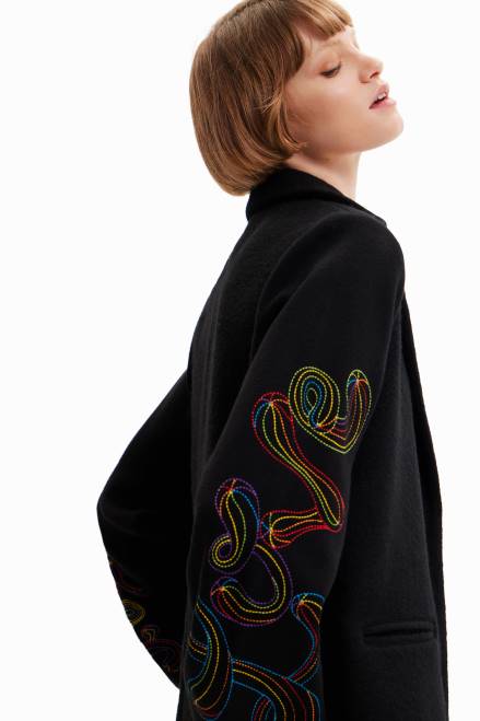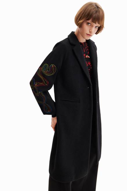 A long wool coat with a lapel collar and knit sleeves with an embroidered message.