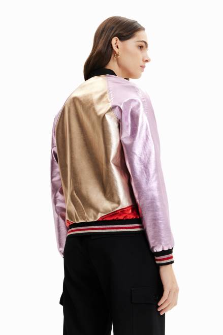 A metallic leather-effect bomber jacket in different colours with a front detail of embroidered flowers.