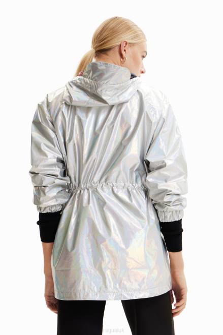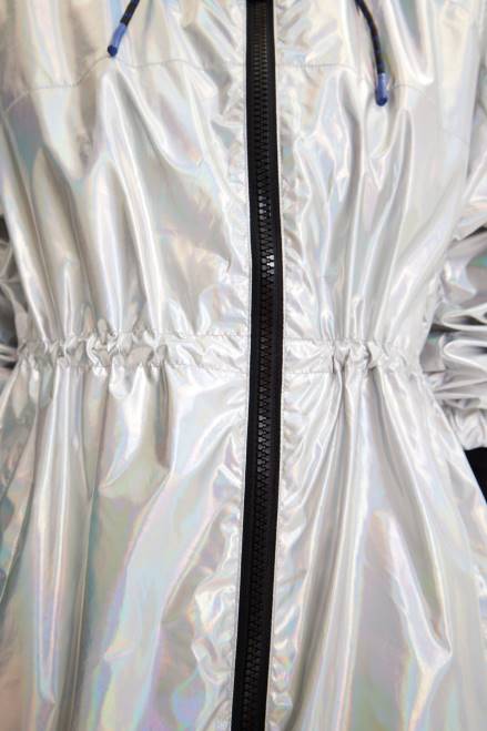 A lightweight parka in iridescent laminated fabric with a hood, an adjustable waist and printed lining.