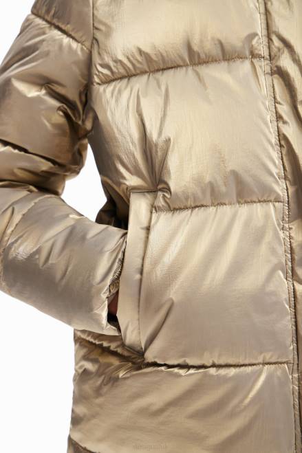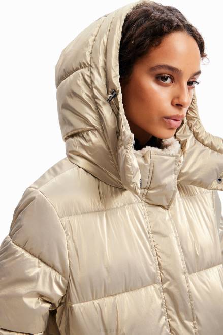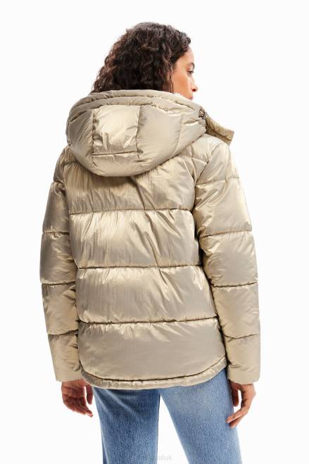A padded jacket with a hood, fleece inner collar and metallic padded fabric.