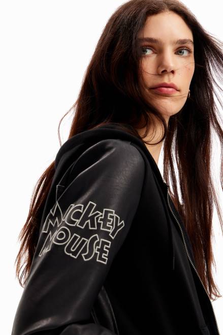 A jacket combining a sweatshirt front and hood with biker-style sleeves and back in leather-effect fabric. With details featuring Disney's Mickey Mouse.