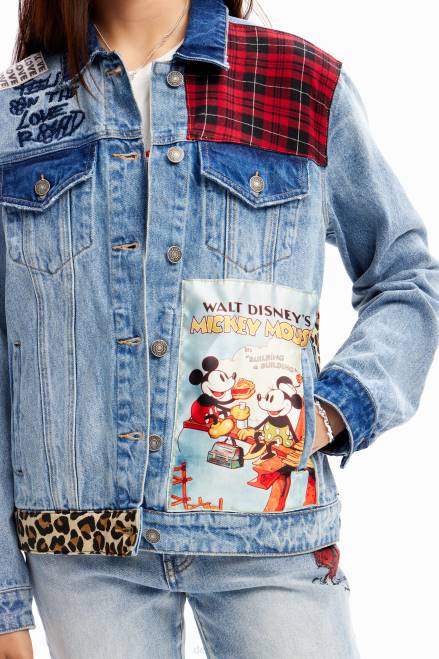 A denim trucker jacket with a patchwork of different fabrics, embroidered messages and prints of Disney's Mickey Mouse.