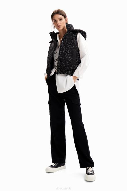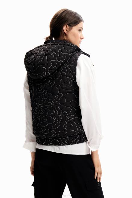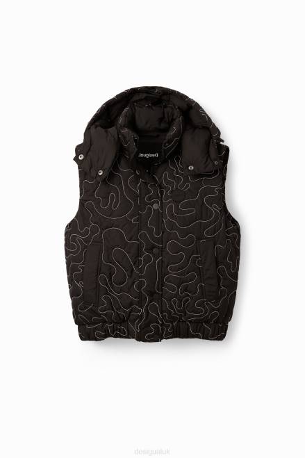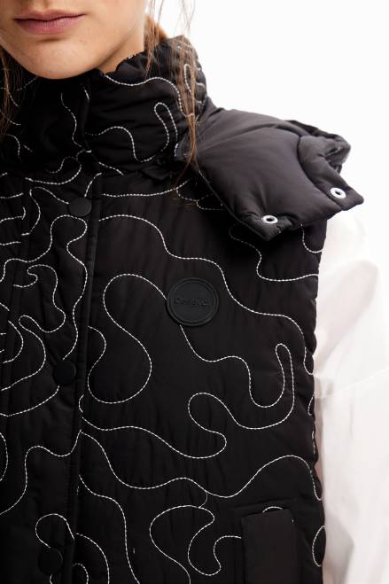 A padded gilet with a detachable hood, double zip, pockets and contrasting stitching.